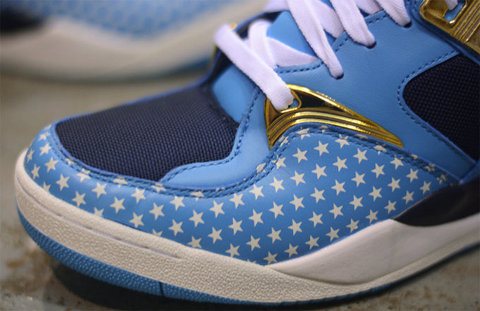 celebrates the O.G. Pump's 25th anniversary, features blue leather panels with navy underlays constructed of mesh. Shiny gold accents and contrasting star graphics in white add some
